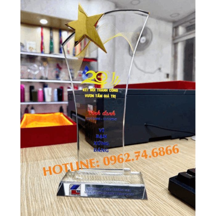 Trong hành trình ghi nhận và tôn vinh những đóng góp nổi bật, mỗi dấu ấn thành tựu đều cần được biểu hiện bằng một món quà ý nghĩa. Cúp pha lê MC0039 được tạo ra như biểu tượng của sự trân trọng, mang theo thông điệp về sự nỗ lực và những cống hiến bền bỉ. Với thiết kế sang trọng, sản phẩm trở thành món quà tri ân hoàn hảo dành cho những cá nhân hay tập thể đạt thành tích xuất sắc.